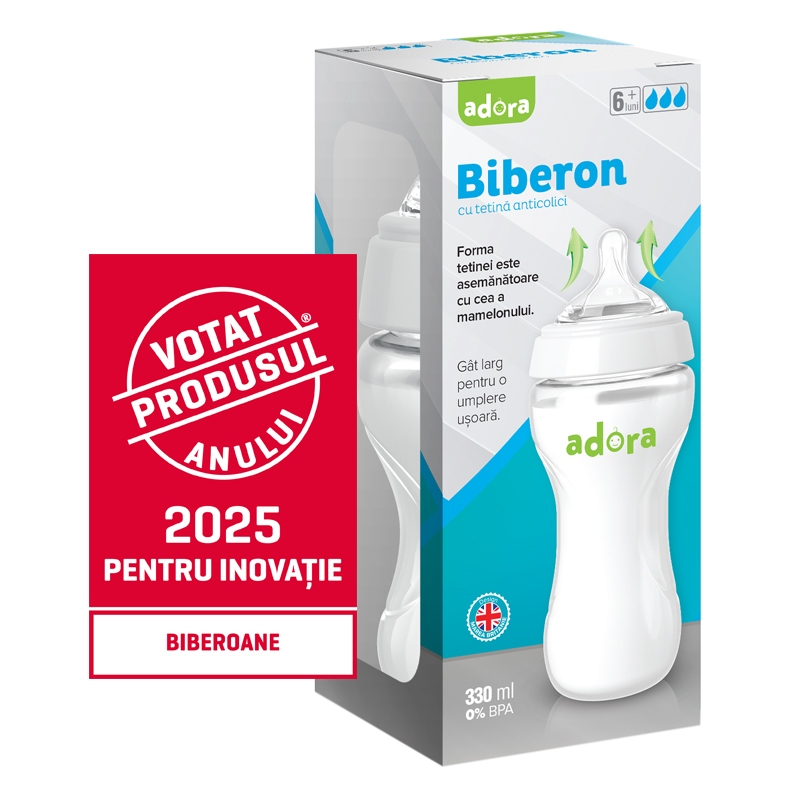 Tetina biberonului Adora, fabricată din silicon moale, nu are gust sau miros, facilitând hrănirea alternativă a copilului, când cu biberonul, când la sân.